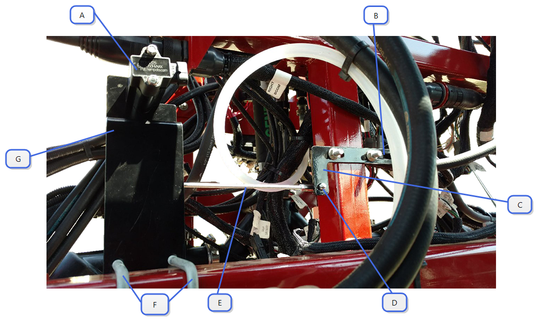 Using a provided 2-9/16” x 3-1/2” U-bolt, loosely install the rotary sensor strap bracket to the upper horizontal tube that pivots (see image below).