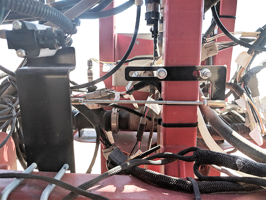 Using a provided 2-9/16” x 3-1/2” U-bolt, loosely install the rotary sensor strap bracket to the vertical tube on the front side of the center rack. The short leg of the bracket will be pointing down on the left side of the center.