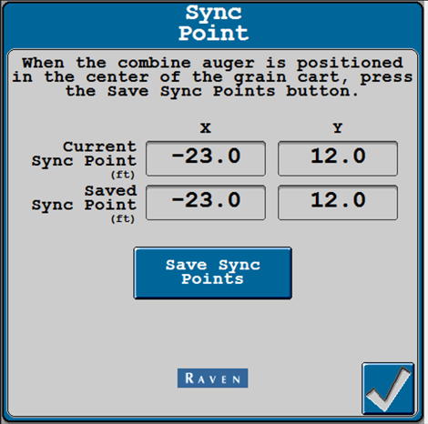 The sync point can be set from the combine while moving from the Cart Remote. The sync point can be set from the tractor while moving from the UI.