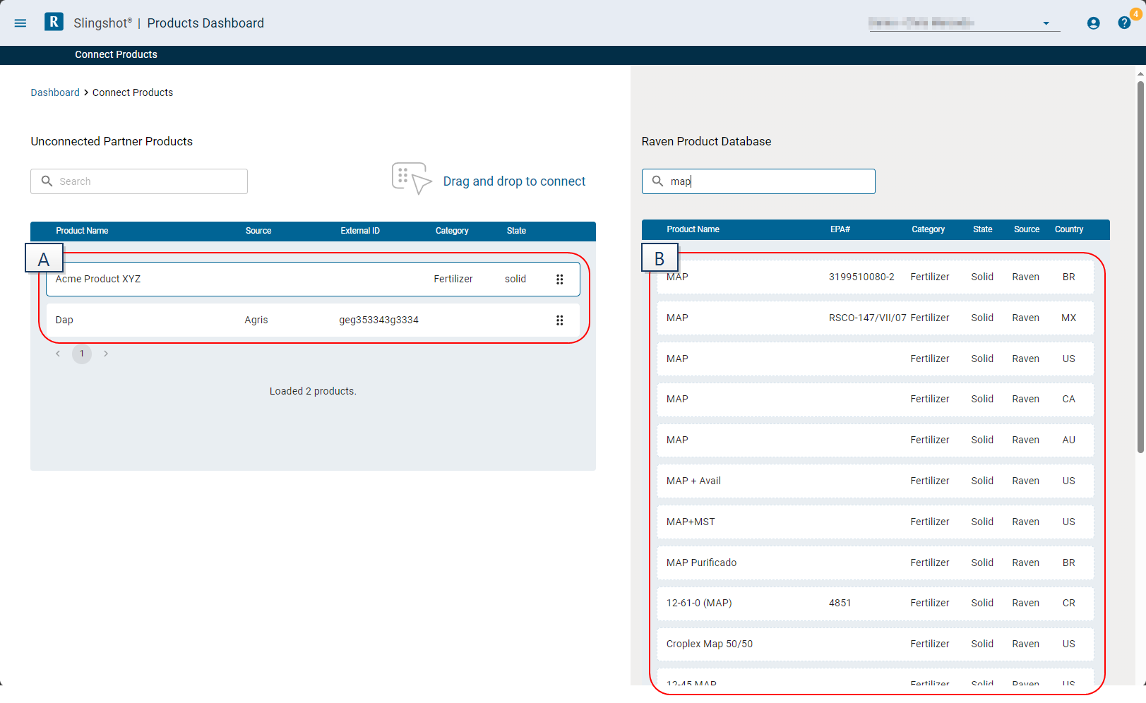 - Use the search fields for either the partner or Raven products as necessary to find the desired products to connect.