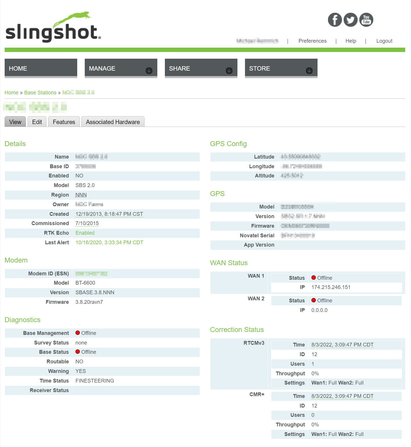 Select the Hardware, Field Hub , or Systems pages to check status and review details for various Slingshot® enabled devices associated with the Slingshot® account.f