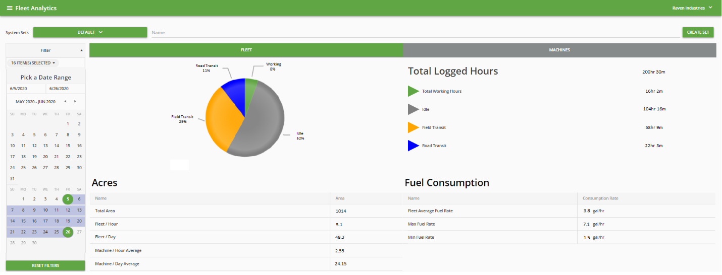 Fleet Analytics offers statistics on productivity and efficiency – acres per day, fuel consumption, transit/working/idle time breakdown, and more.