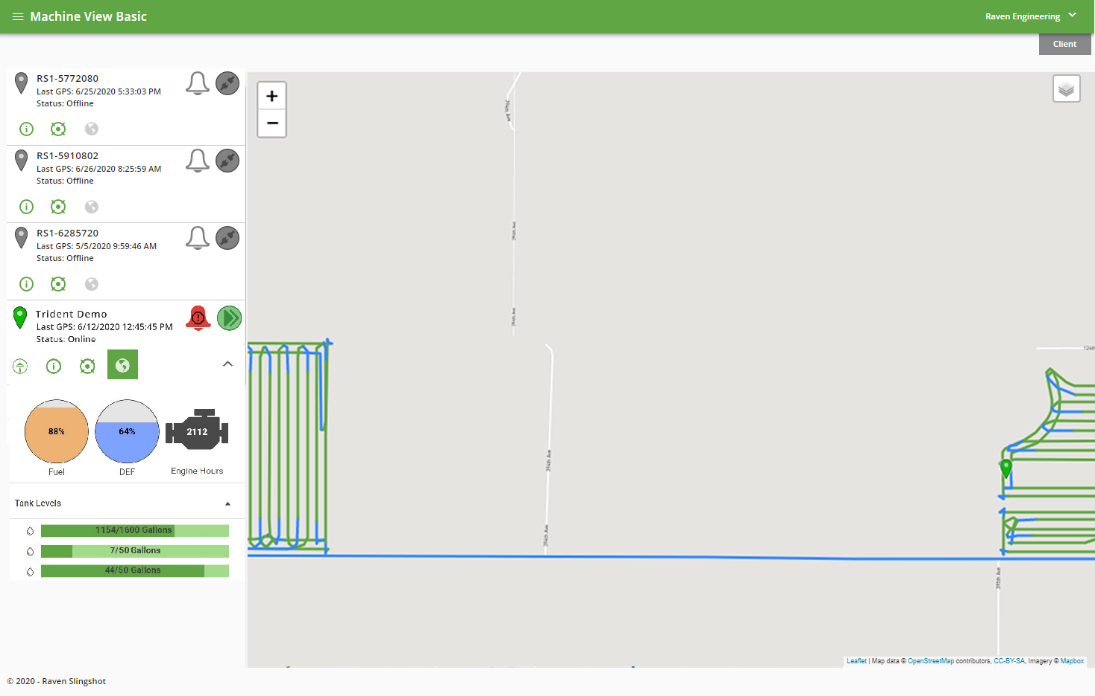the exchange and transmission of data and analytics between field and office. Raven telematics may include information such as job status, coverage maps, machine and fleet analytics, job status, etc. icon does not turn green: